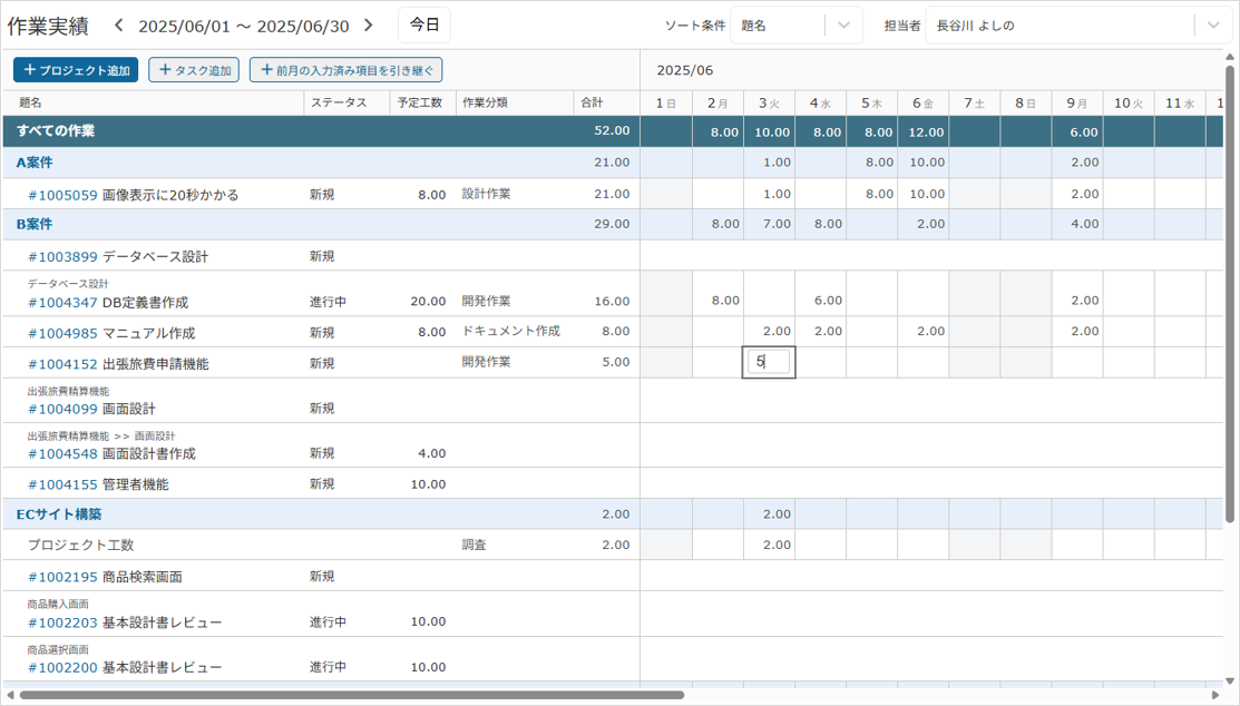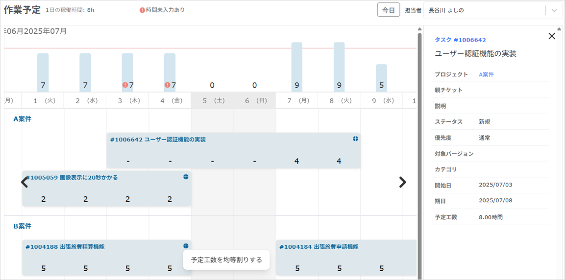 ガントチャートの計画を反映しているので、割り当てられたタスクに対して、予定する作業時間を入れるだけで簡単に工数計画ができます。