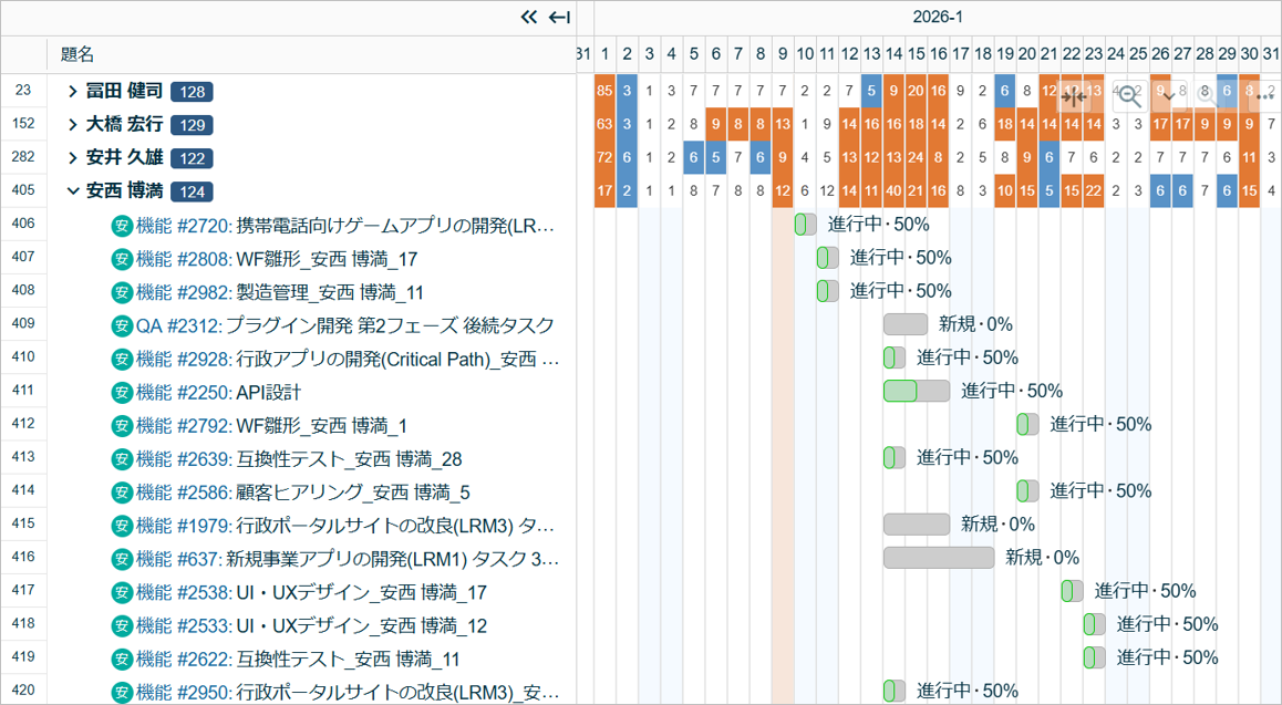 Lychee Redmineでは、ガントチャートで超過作業時間となっている箇所を把握できます。割り当て時間に対して超過となっている日は赤色でハイライトされるので、プロジェクトの進捗が遅れる要素となる「負荷状況の偏り」を把握して調整しやすくなります。リソース管理機能では、プロジェクトメンバーの予定と実績の工数表示や、担当者の稼働率をグラフで表示したり、作業負荷が一定のメンバーに偏っていないか確認することもできます。
