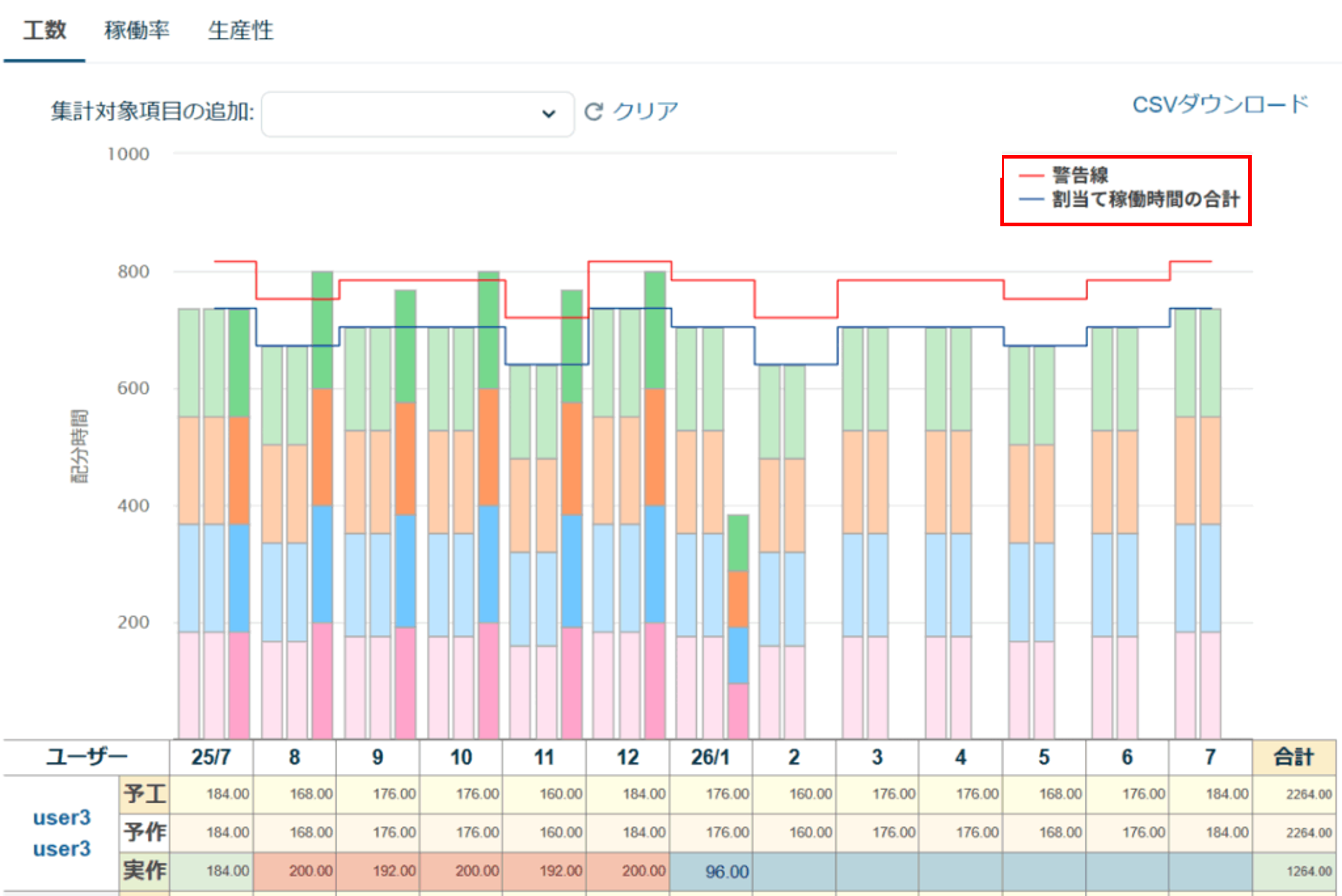集計対象ユーザーの稼働時間の合計線および警告線をグラフに表示しました。