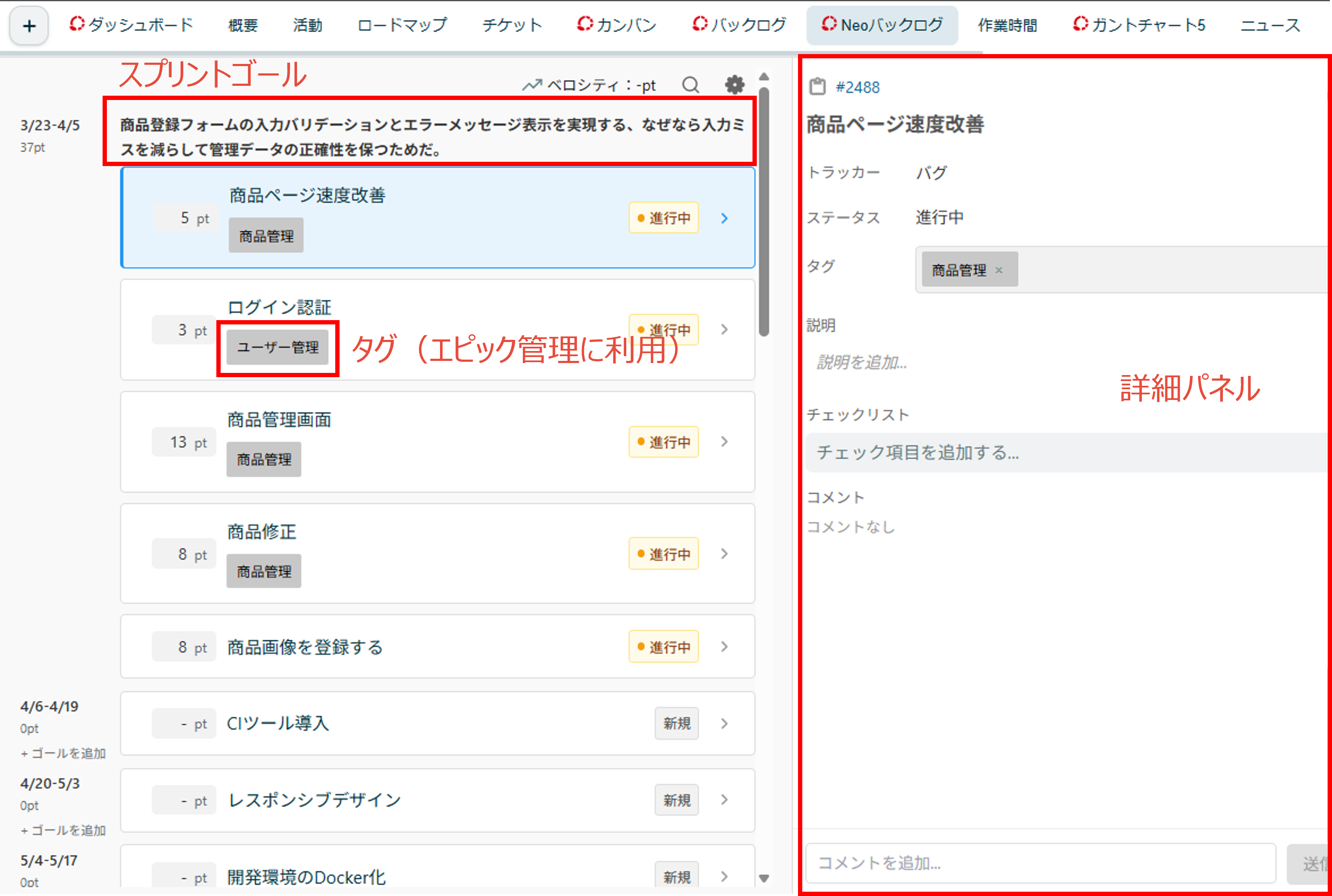 - 「ユーザー管理」「決済機能」などタグを付ければ、Neoバックログ上でテーマごとの分類がひと目でわかります。