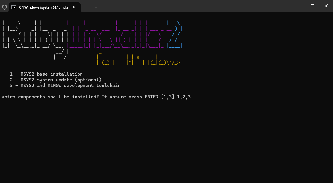 プロンプトが起動しますので以下のように「1, 2, 3」と入力してエンターキーを押し関連するパッケージのインストールを行ってください。